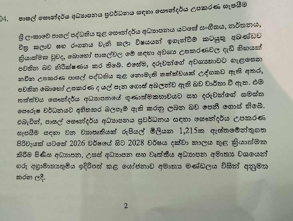 පාසල් සෞන්දර්ය අධ්යාපනය ප්රවර්ධනය සඳහා සෞන්දර්ය උපකරණ සැපයීම සඳහා වන ව්යාපෘතියක් සඳහා කැබිනට් අනුමැතිය හිමිව තිබේ.