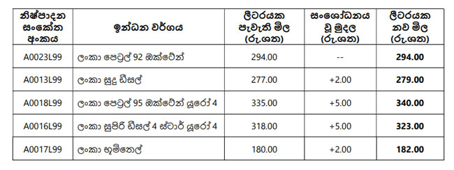ඒ අනුව, ලංකා සුදු ඩීසල් ලීටරයක් රුපියල් 2කින්, ඔක්ටේන් 95 පෙට්රල් ලීටරයක් රුපියල් 5කින්, ලංකා සුපිරි ඩීසල් ලීටරයක් රුපියල් 5කින් සහ ලංකා භූමිතෙල් ලීටරයක් රුපියල් 2කින් වැඩිකර තිබේ.