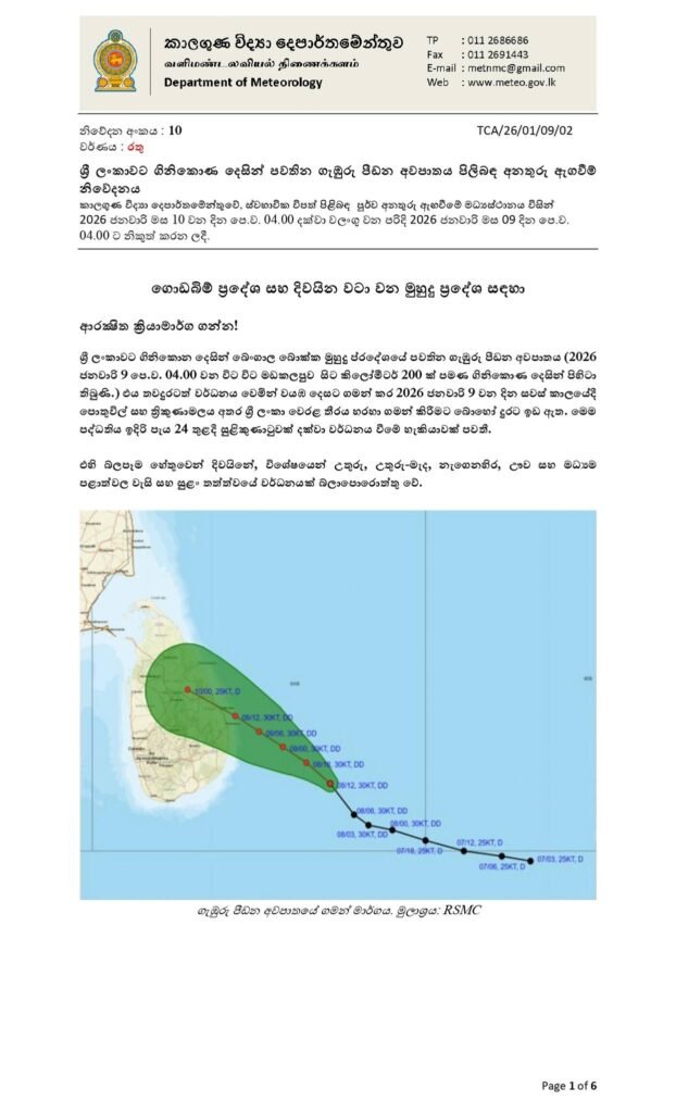 ශ්රී ලංකාවට ගිනිකොන දෙසින් බෙංගාල බොක්ක මුහුදු ප්රදේශයේ පවතින ගැඹුරු පීඩන අවපාතය (2026 ජනවාරි 9 පෙ.ව. 04.00 වන විට විට මඩකලපුව සිට කිලෝමීටර් 200 ක් පමණ ගිනිකොණ දෙසින් පිහිටා තිබුණි.) එය තවදුරටත් වර්ධනය වෙමින් වයඹ දෙසට ගමන් කර 2026 ජනවාරි 9 වන දින සවස් කාලයේදී පොතුවිල් සහ ත්රිකුණාමලය අතර ශ්රී ලංකා වෙරළ තීරය හරහා ගමන් කිරීමට බොහෝ දුරට ඉඩ ඇති බව කාලගුණ විද්යා දෙපාර්තමේන්තුව නිවේදනය කරයි.