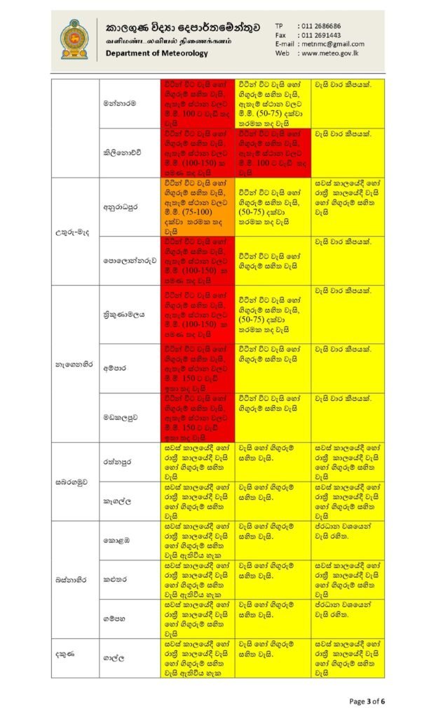 උතුරු, උතුරු-මැද පළාත්වලත් මාතලේ, ත්රිකුණාමලය සහ පුත්තලම දිස්ත්රික්කවලත් ඇතැම් ස්ථානවලට මි.මී. 100 ට වැඩි තද වැසි ඇති විය හැකි අතර මහනුවර, නුවරඑළිය සහ මඩකලපුව දිස්ත්රික්කවලත් ඇතැම් ස්ථානවලට මි.මී. (50-75) ක පමණ තරමක තද වැසි ඇති විය හැක.