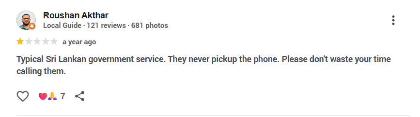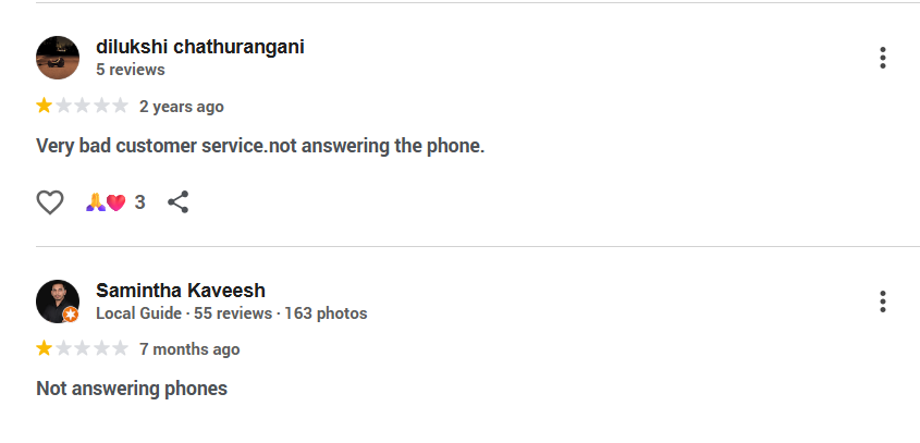 දුරකතන අංක අවම තරමේ දෙකක් හෝ ලබා දී දුරකතන ක්රියාකරවන්නෙකු මේ සඳහා යෙදවීමට නොහැකි තරමට මැණික් කටයුතු බලන සංස්ථාව බංකොලොත්ද? මෙම දුරකතන අංකයට කිසිවෙකු පිළිතුරු නොදීමත් සංස්ථාවේ කාර්යභාරයත් ගැන ගූගල් රිවීව් කියවීමෙන් වටහාගත හැකි ය. ඉන් කිහිපයක් පහත පළ වේ.