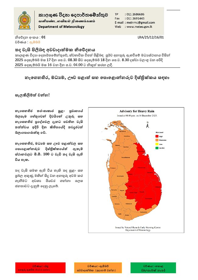 අද (16) ප.ව. 04.00ට නිකුත් කරන ලද එම නිවේනදය හෙට (17) පෙ.ව. 08.30 සිට අනිද්දා (18) දින පෙ.ව. 8.30 දක්වා වලංගු වන පරිදි එම නිවේනදය නිකුත් කර ඇත.