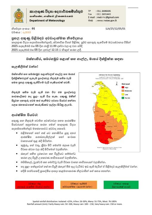 බස්නාහිර, සබරගමුව පළාත් සහ ගාල්ල හා මාතර දිස්ත්රික්ක සඳහා ප්රබල අකුණු පිළිබඳව අවවාදාත්මක නිවේදනයක් නිකුත් කර තිබේ.