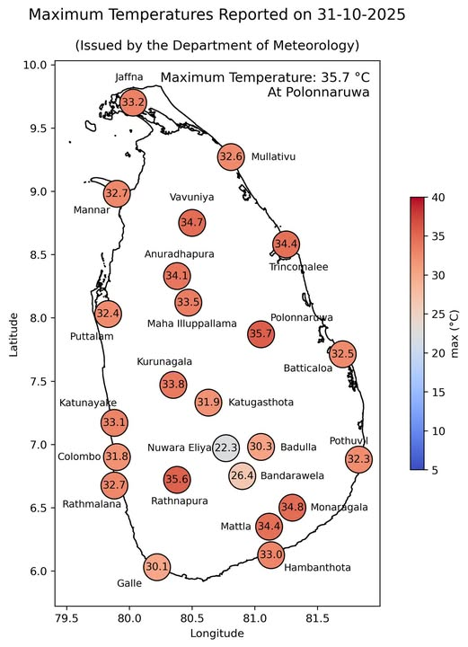 ඊයේ (31) රට පුරා උණුසුම් තත්වයක් පැවති අතර ඉහළම උෂ්ණත්වය සෙල්සියස් අංශක 35.7 ක් ලෙස පොලොන්නරුව කාලගුණ මධ්යස්ථානයෙන් වාර්තා වී ඇත. දිවයින පුරා එම තත්වය ඊයේ මෙලෙස පැවතී ඇති අතර අගයන් පහත පරිදි වේ.