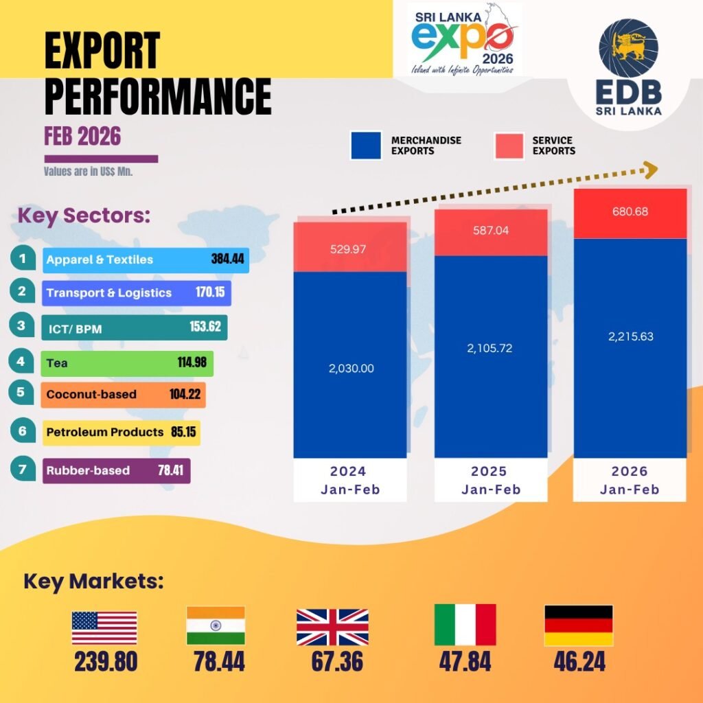 2026 පෙබරවාරි මාසයේදී වෙළඳ භාණ්ඩ සහ සේවා යන දෙකම ඇතුළුව ශ්රී ලංකාවේ මුළු අපනයන ඇමරිකානු ඩොලර් මිලියන 1,401.78ක් බව අපනයන සංවර්ධන මණ්ඩලය පවසයි.