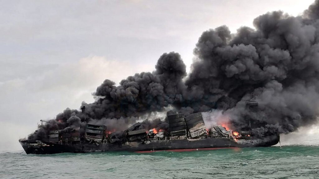 2021 ජූනි මාසයේදී කොළඹ වරාය ආසන්නයේ ගිනි ගැනීමකට ලක්වූ MV X-Press Pearl නෞකාව, සති දෙකක් පමණ ඇවිලී ගිය ගින්නකින් පසුව මුහුදුබත් විය.